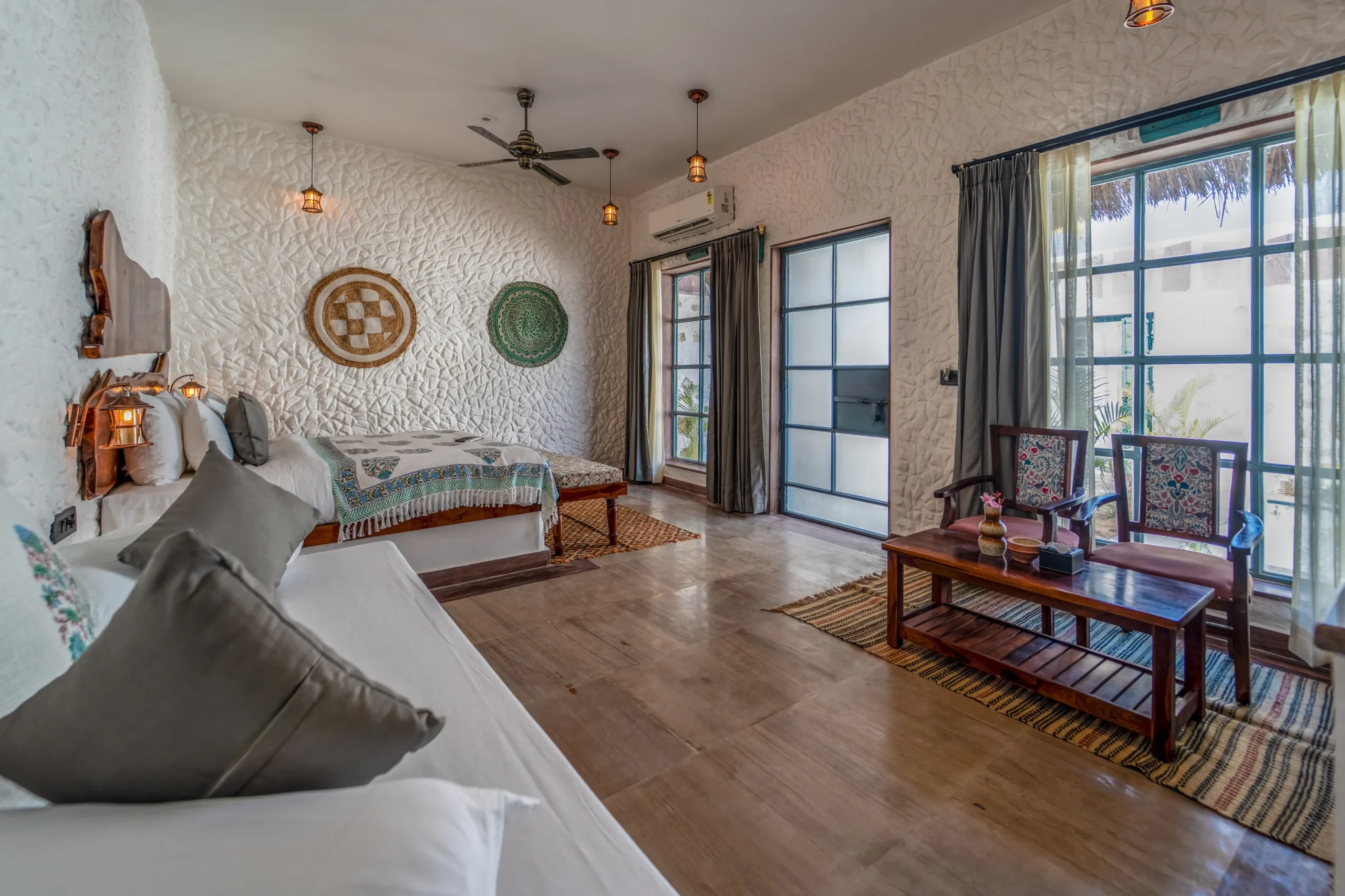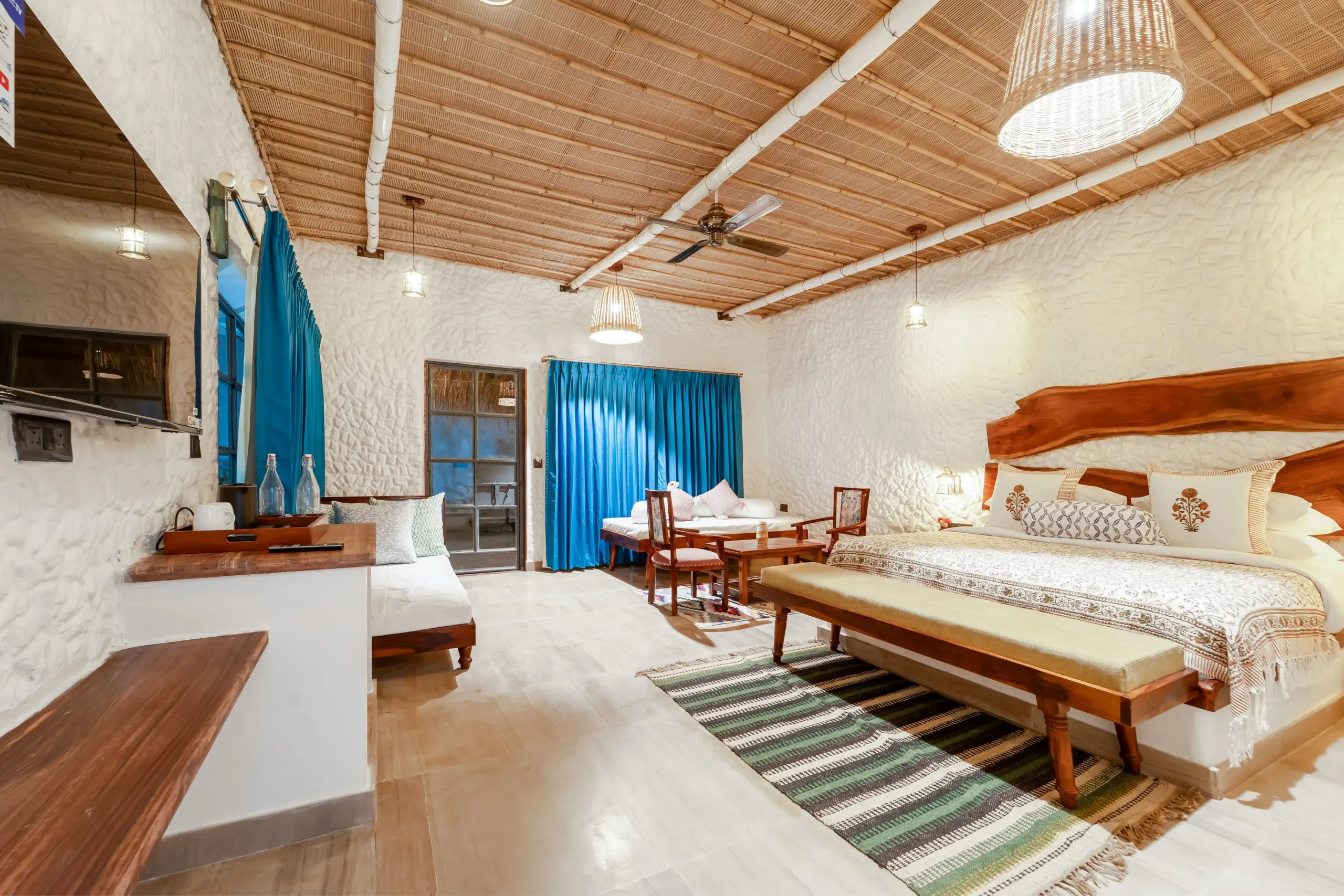The rooftop bedding area is designed for slow evenings under open skies — perfect for stargazing, unwinding, or simply listening to the wind move through the dunes. From here, you can witness sunrises over the Aravalis and the gentle rhythm of sprinklers across nearby farmlands, painting the mornings with a soft, rural serenity.
