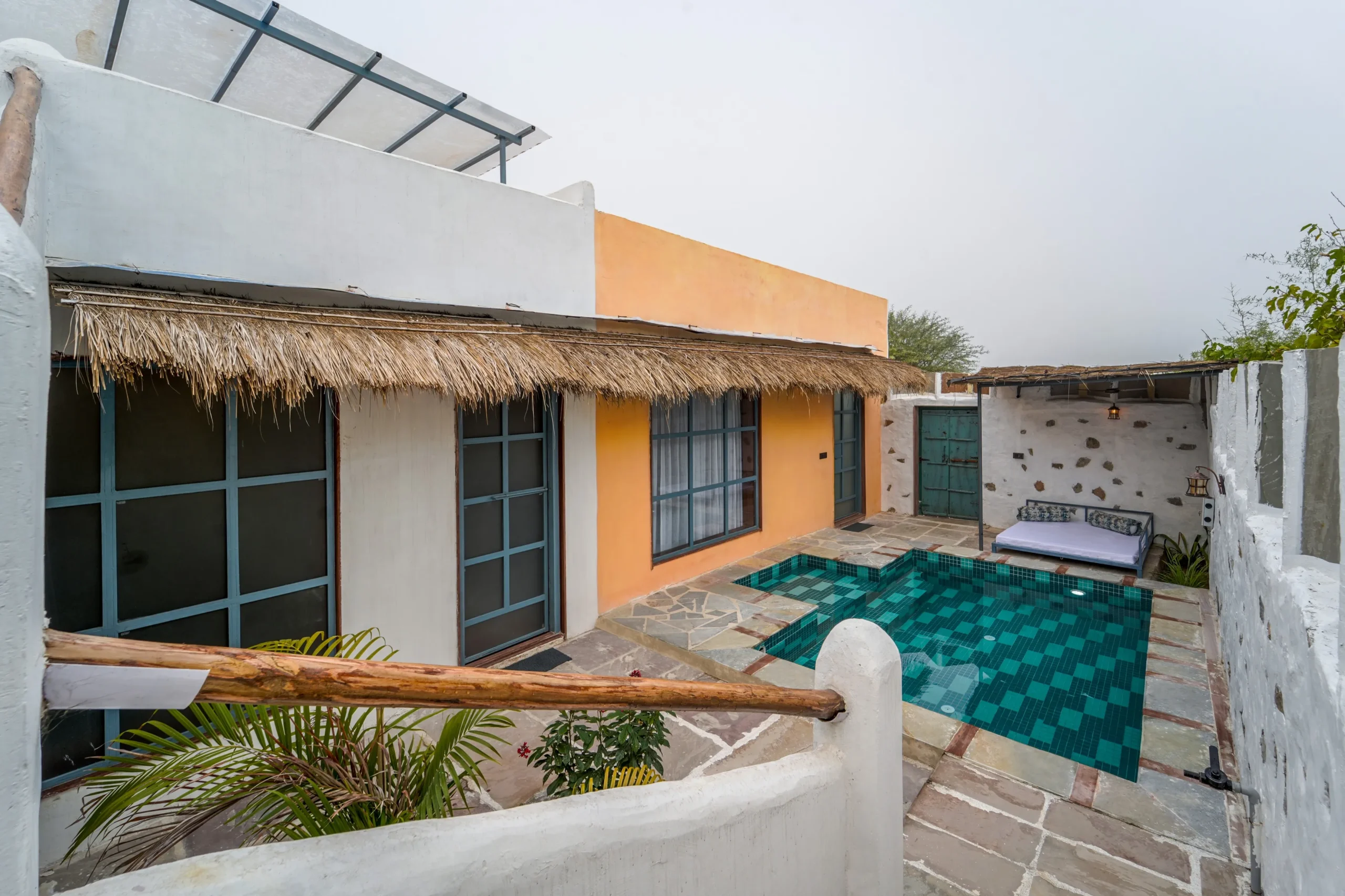 Expansive and thoughtfully designed, the Two-Bedroom Pool Pavilion offers generous spacious living with a 12×28 ft private pool, a rustic rooftop for evening gatherings, and open views of the surrounding landscape — from fertile farmlands to the gentle rise of the Aravalis and dunes that stay lush for most of the year and turn golden in summer.